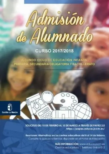 Las familias castellano-manchegas podrán presentar entre el 15 de febrero y el 15 de marzo las solicitudes para obtener una plaza en un centro docente público o concertado de Castilla-La Mancha, el próximo curso 2017-2018, en el segundo ciclo de Educación Infantil, Educación Primaria, Educación Secundaria Obligatoria y Bachillerato. Más información aquí.