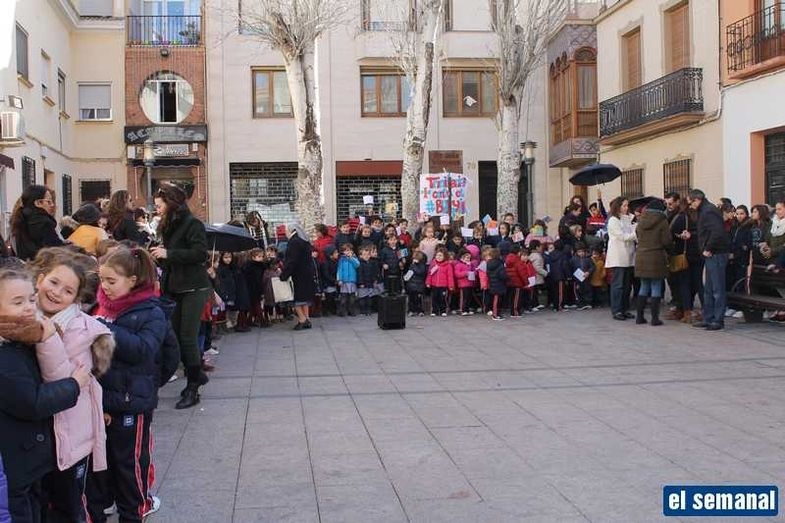 Alumnos de Infantil y todo Primaria del colegio Nuestra Señora de la Trinidad de Alcázar de San Juan han salido este martes a la calle para proclamar la paz y la no violencia, en su Día Internacional, y además proclamar su rechazo al acoso escolar, un tema que se ha tratado durante estos días para que los niños tomen conciencia.