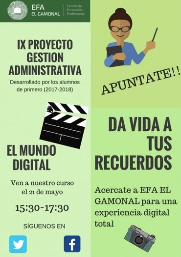 El Proyecto "DA VIDA A TUS RECUERDOS", realizado por el Ciclo de Gestión Administrativa, se ha desarrollado en el centro alcazareño con el objetivo de ampliar los procedimientos de los alumnos. Paralelo a este objetivo se incentiva y motiva a las personas participantes del entorno, que han conseguido editar su película dando vida a sus recuerdos.