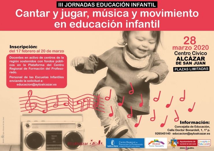 El ayuntamiento de Alcázar de San Juan en colaboración con el Centro Regional de Profesorado de la JJCC de Castilla La Mancha ha organizado las III Jornadas de Educación Infantil: Cantar y jugar, música y movimiento en Educación Infantil, que pretenden ser un espacio de encuentro, formación e intercambio de experiencias dirigidas a los maestros/as y técnicos de Educación Infantil de 0 – 6 años.