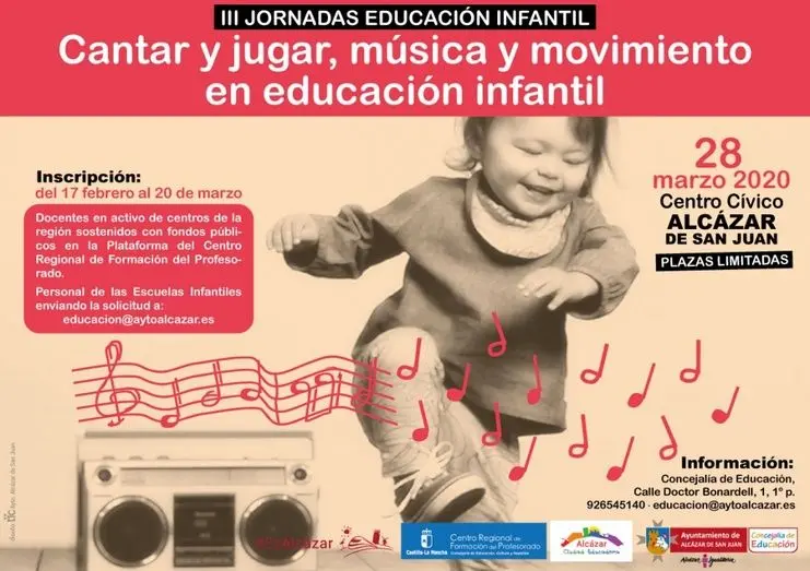 El ayuntamiento de Alcázar de San Juan en colaboración con el Centro Regional de Profesorado de la JJCC de Castilla La Mancha ha organizado las III Jornadas de Educación Infantil: Cantar y jugar, música y movimiento en Educación Infantil, que pretenden ser un espacio de encuentro, formación e intercambio de experiencias dirigidas a los maestros/as y técnicos de Educación Infantil de 0 – 6 años.