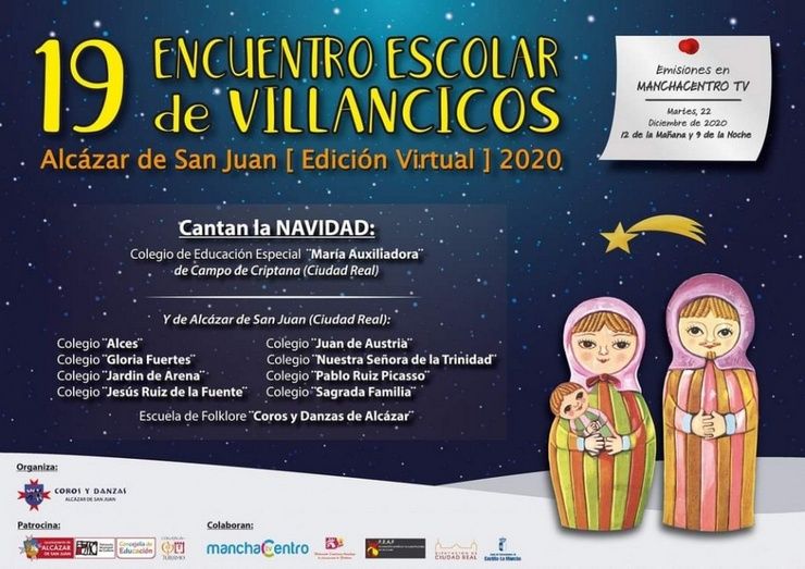 El XIX Encuentro Escolar de Villancicos que organiza cada año en Alcázar de San Juan la Asociación de coros y Danzas de la ciudad se celebrará este año de forma virtual, y se podrá ver a través de Mancha Centro TV el día 22, día del Festival, a las 12 de la mañana y 9 de la noche.