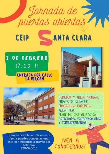 El CEIP Santa Clara de Alcázar de San Juan celebrará el próximo miércoles, 2 de febrero, una Jornada de Puertas Abiertas destinada a aquellas familias interesadas en conocer este centro educativo de cara al próximo proceso de admisión del alumnado.