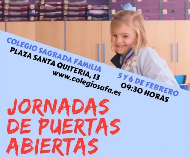 El Colegio Sagrada Familia de Alcázar de San Juan organizará unas Jornadas de Puertas Abiertas para las familias de nueva incorporación que estén interesadas.Se llevará a cabo los días 5 y 6 de febrero a las 09:30 horas en Ed. Infantil y Ed. Primaria y el día 6 de Febrero a las 16:00 horas para E.S.O.