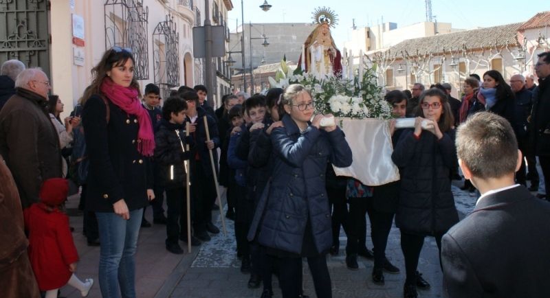 Los alumnos y alumnas del colegio de la Sagrada Familia de Alcázar de San Juan han vuelto a salir este año en procesión por las calles de Alcázar, en esta ocasión en jueves por las previsiones de lluvia para el viernes. La procesión, como ya ocurriera el pasado año, ha sido multitudinaria, ya que han participado todos los niños del centro así como padres y profesores y ha generado una gran expectación en la calle.