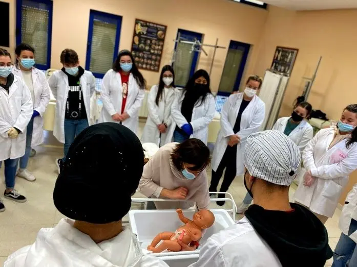 Fuentes habló de la atención inmediata y cuidados iniciales del recién nacido y la madre; para posteriormente poner en práctica todos los procedimientos tratados, desde que el bebé llega de paritorio junto a la mamá a la planta de Tocoginecología hasta que son dados de alta hospitalaria. Los alumnos interactuaron en todo momento, mostrando y exponiendo sus dudas y curiosidades sobre el tema.
