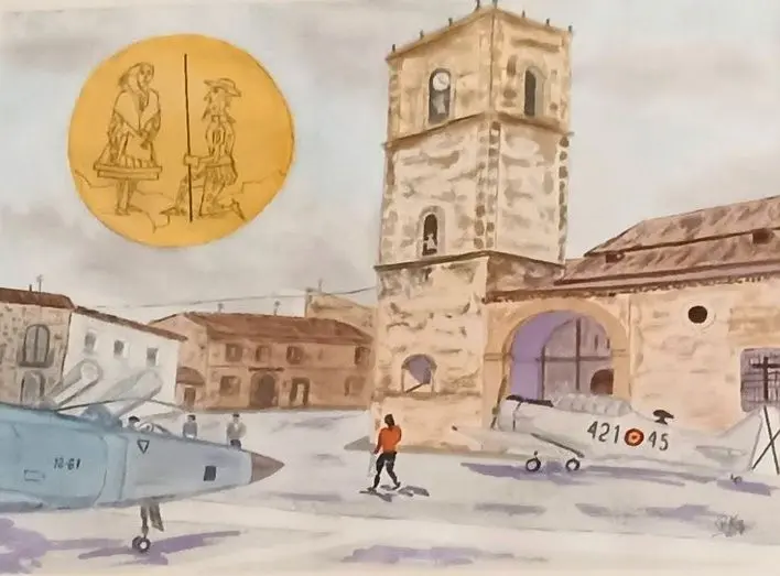 La acuarela, que puede contemplarse en el Ayuntamiento, refleja una escena en la que aparecen dos aviones en la Plaza de El Toboso con vecinos paseando entre ellos y admirándolos. Fue uno de los actos que se organizaron para dar a conocer a la ciudadanía el vuelo inaugural de 1928 que recorrería la ‘Ruta de Don Quijote’ formando parte del programa de eventos de la Exposición Internacional de 1929.