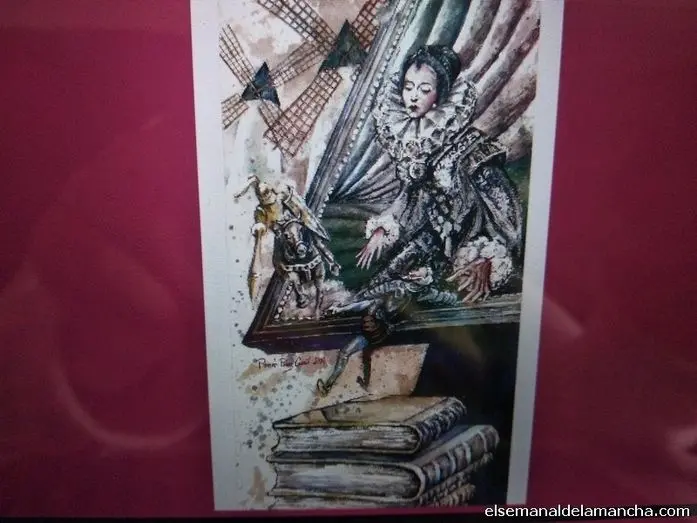 La exposición “El Toboso. Dulcinea elevada a mito” se compone de 40 láminas originales que han servido de ilustración a tres de las obras que la editorial Linteo ha publicado como homenaje a Miguel de Cervantes. La más reciente, y que será presentada en la propia localidad de El Toboso el próximo 27 de mayo coincidiendo con la clausura de la muestra, es Dulcinea del Toboso, un libro dedicado en exclusiva a la amada del ingenioso hidalgo, a la “más bella mujer del mundo” –según destaca Don Quijote–, y figura femenina más internacional de la localidad toledana. Es por eso que ella da nombre a la exhibición y a ella se le dedica el espacio principal: la sala de exposiciones. Aquí se pueden ver diez imágenes realizadas con la técnica del gouache y un óleo sobre lienzo en las que se nos presenta a una Dulcinea “reina y señora”, junto con otras cinco láminas que completan las ilustraciones del libro.