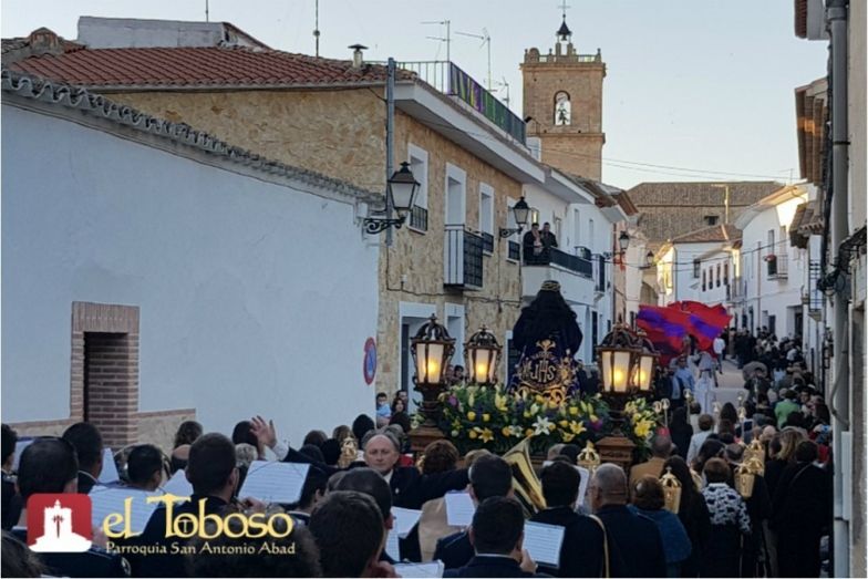 El cortejo procesional de traslado desde la ermita del patrón de El Toboso hasta la Iglesia Parroquial contó con la presencia de los Oferentes, Bandera, banda de música “Santa Cecilia”, damas del Cristo 2017 y las nuevas de este 2018, niños y niñas de Primera Comunión, corporación municipal del Ayuntamiento toboseño, Presidente y Junta de Gobierno de la Hermandad del Cristo, monaguillos y el clero, conformado por el párroco de la localidad, D. Juan Miguel Romeralo Santiago y por los sacerdotes toboseños D. Miguel Ángel Lozano, sacerdote diocesano de Arusha y colaborador de los Misioneros Espiritanos, en Mangola (Tanzania-África); D. Santos Alcolado Martínez, párroco de Cabezamesada; D. José Benito Gallego Marchante, sacerdote operario diocesano y actualmente trabajando como Vicerrector del Seminario Metropolitano de Zaragoza; y D. Alfonso Ramirez Muñoz, párroco de Santa María de Benquerencia de Toledo, quien además será el predicador del Quinario de este año. Y un sin fin de fieles y devotos que abarrotaban las calles por donde iba pasando la procesión hasta llegar a la Iglesia Parroquial, apellidada también como “La Catedral de La Mancha”.