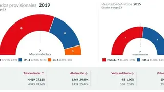 Ciudadanos, por su parte, entra en la Corporación, con un concejal, Jesús Fernández Almoguera, anterior alcalde socialista, gracias a los 348 votos obtenidos, un 8,06%