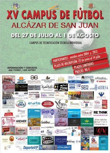 Desde ayer lunes 22 de Junio y hasta el próximo martes 14 de Julio estarán abiertas las inscripciones para el decimoquinto Campus de la Escuela de fútbol Alcázar de san Juan. Promete ser una experiencia de lo más divertida. Un Campus que se celebrará del 27 de julio al 1 de agosto. Para niñ@s nacid@s entre 2004 y 2013.El precio es de 90€.