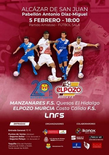 El Pabellón Antonio Díaz-Miguel acogerá, el próximo sábado 5 de febrero, el partido amistoso de fútbol sala entre los equipos de Liga Nacional del Manzanares F.S. Quesos El Hidalgo y El Pozo Murcia Costa Cálida F.S. que dará comienzo a las 18:00h. El precio de las entradas es de 10 euros. Saldrán a la venta el miércoles 26 de enero.