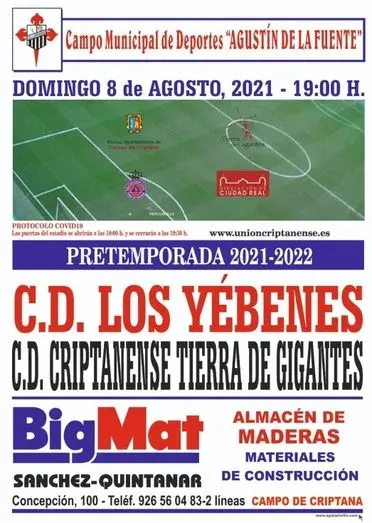 Tras completar las cuatro primeras sesiones de entrenamientos de pretemporada, el CDU Criptanense “Tierra de Gigantes”, disputará este próximo domingo a partir de las 19:00 horas en el municipal “Agustín de la Fuente”, su primer partido de pretemporada frente al CD Los Yébenes.
