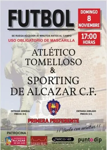 Por lo tanto, los aficionados alcazareños y todo aquel que desee presenciar fútbol en directo de toda la comarca e incluso aficionados del equipo visitante, Atlético Tomelloso, podrán disfrutar este domingo a partir de las 17:00 horas de este derbi entre dos históricos de nuestro fútbol regional, tras aplazarse el derbi del pasado domingo día 1 de Noviembre, que debía enfrentar en el mismo escenario al Sporting de Alcázar y el CDB Herencia CF.