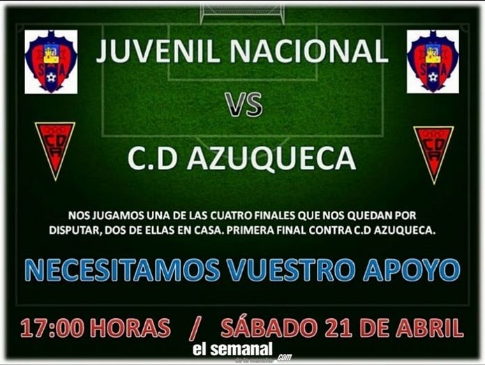 El equipo juvenil nacional del Sporting de Alcázar disputará este sábado (17:00 horas) en el Campo Manolo Delgado Meco de la localidad la primera de las cuatro finales a las que se enfrentará de aquí hasta final de liga. En partido correspondiente a la jornada 31, los de Felix Monreal, 15º en la clasificación, jugarán frente a Azuqueca (5º) en un partido vital para mantener la categoría.