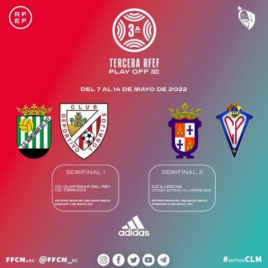 Vive la auténtica fiesta del fútbol modesto, Vive en directo las semifinales del Playoff de Ascenso a Segunda RFEF que disputarán este sábado los equipos, CD Quintanar del Rey vs CD Torrijos y el domingo CD Illescas vs Don Octavio CP Villarrobledo, en busca de la gran final del 14 de mayo en Tomelloso.