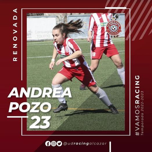 Junto a Nerea, seguirá una temporada más en el Racing de Alcázar, Andrea Pozo. Pieza clave en el centro del campo gracias a su gran precisión en el pase y su enorme calidad técnica. Será su cuarta temporada en el equipo rojiblanco. ¡Orgullosos de que sigas vistiendo la rojiblanca!