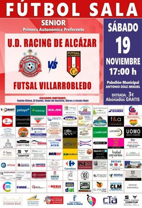 El mítico pabellón Antonio Díaz-Miguel de Alcázar de San Juan, volverá a acoger este sábado, otro auténtico partidazo de fútbol-sala. Como en las gradas tardes, la junta directiva del Racing de Alcázar, prepara un evento en el que su equipo, noveno clasificado de la primera autonómica preferente con 12 puntos, tras sumar tres victorias consecutivas, recibirá al Futsal Villarrobledo, cuarto clasificado con 17 puntos, cinco más que los rojiblancos.