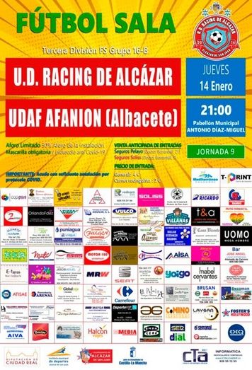 El equipo de Tercera División de Fútbol-Sala del Racing de Alcázar recibirá este jueves a partir de las 21:00 horas en el pabellón Antonio Díaz-Miguel y en partido pendiente de la jornada 9ª, aplazado el pasado fin de semana por las inclemencias meteorológicas al UDAF Afanion Albacete.