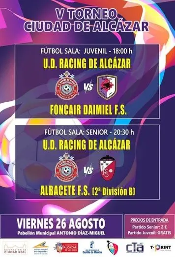 Primeros amistosos de pretemporada para los equipos de fútbol-sala del Racing de Alcázar este viernes, con motivo del Torneo Ciudad de Alcázar 2022. Tras sus dos primeras semanas de entrenamientos de pretemporada completados, el nuevo proyecto rojiblanco disputará sus primeros partidos en casa, recibiendo el viernes en el caso del equipo de Primera Autonómica Preferente, a un rival de lujo, el Albacete FS de Segunda División “B” a partir de las 20:30 horas en el pabellón Antonio Díaz-Miguel y antes, en el mismo escenario, a partir de las 18:00 horas, el juvenil provincial del club alcazareño, recibirá al juvenil del Foncair Daimiel FS.