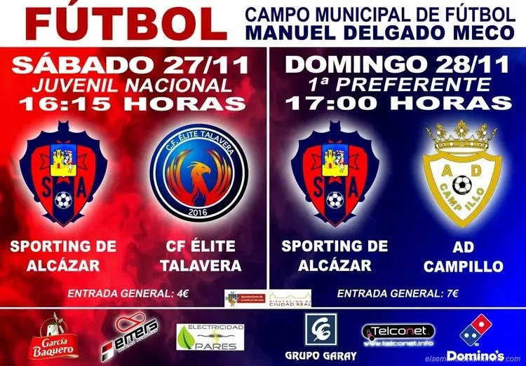 El juvenil nacional del Sporting de Alcázar tendrá un complicado partido en casa este sábado a partir de las 16:15 horas en el municipal “Manuel Delgado Meco”, frente al CF Élite Talavera con arbitraje del consaburense Raúl Tarjuelo Quijorna.