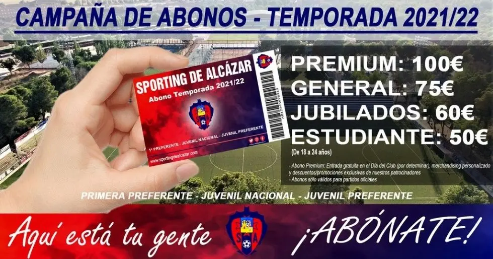 El club alcazareño, ha hecho público a través de sus redes sociales, de las diferentes modalidades de abonos: Carnet General: 75€, Jubilado: 60€ y estudiante (de 18 a 24 años): 50€. Todos ellos, darán acceso al “Manuel Delgado Meco” para presenciar en directo cualquiera de los partidos oficiales que el Sporting de Alcázar juegue (1ª Preferente, Juvenil Nacional y Juvenil Preferente), excepto los encuentros de pretemporada y los tradicionales “día de apoyo al club”, donde los abonados podrán adquirir su entrada a un precio “muy asequible”, apuntan desde la directiva.