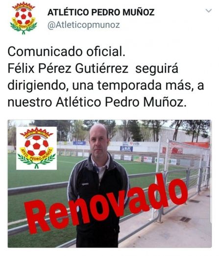 Tras el consumado descenso a la 1 Autonómica, el conjunto del Atco. Pedro Muñoz junto a su directiva y su presidente en funciones, Sergio Bravo, llegaban el martes a un acuerdo con la renovación del técnico, Félix Pérez, una temporada más dirigiendo la nave pedroteña, y con la intención y el objetivo de llevar al equipo a la categoría perdida.