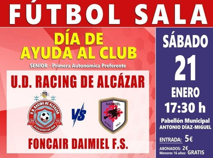 Este sábado 21 de enero, a las 17:30 h, con motivo del partido de la liga regular en categoría Primera Preferente Autonómica de Futbol Sala entre los equipos UD. RACING DE ALCAZAR y FONCAIR DAIMIEL FS, el pabellón Antonio Díaz Miguel, albergará una auténtica fiesta de este deporte, por la categoría de partido que se trata.
