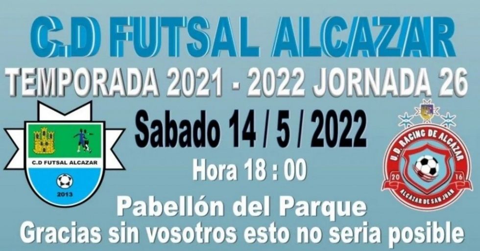 Este sábado a partir de las 18:00 horas en el pabellón Pablo Ruiz Picasso (Parque) de Alcázar de San Juan y con arbitraje de Manuel Avilés Macancela, se disputará el derbi local de la liga juvenil autonómica de fútbol-sala, entre el CD Futsal Alcázar y el UD Racing de Alcázar, correspondiente a la vigésimo sexta y última jornada de competición en el grupo 2.