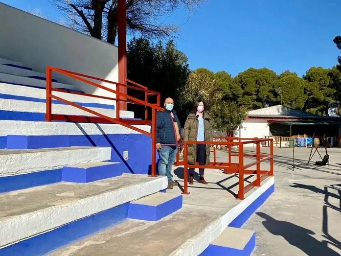 La alcaldesa de Alcázar de San Juan, Rosa Melchor, acompañada del presidente del Instituto Municipal de Deportes y responsable de las instalaciones deportivas, Javier Ortega, ha presentado la nueva rampa de acceso a la grada del Campo de Fútbol A para personas con movilidad reducida.