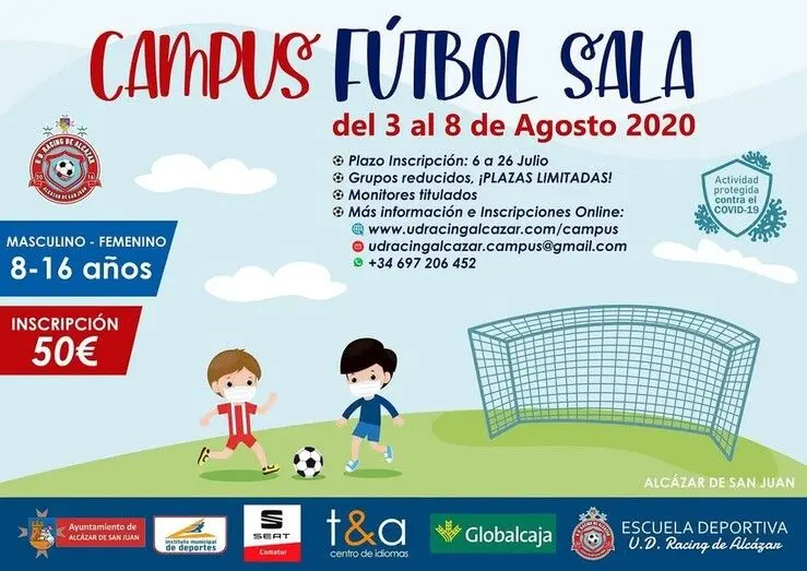 Hasta este próximo domingo 26 de Julio estará abierta la inscripción para el Campus de Fútbol-Sala del Racing de Alcázar. Este Campus para niños y niñas de entre 8 a 16 años, estará organizado por el CD UD Racing de Alcázar con la inestimable colaboración de la concejalía de Deportes del Ayuntamiento de Alcázar y el Instituto Municipal de Deportes y de otras empresas y entidades de ámbito comarcal y se celebrará del 3 al 8 de Agosto en horario de mañana de 9 a 14 horas.