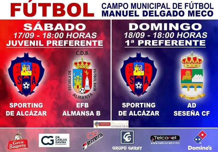 Este fin de semana se alcanza la tercera jornada del grupo 2 de la liga autonómica preferente y además, arranca oficialmente la competición juvenil preferente y provincial con el debut de los dos equipos del Sporting de Alcázar. Después de sumar cuatro puntos de seis posibles en las dos primeras jornadas de liga, el primer equipo del club alcazareño, recibirá el domingo a partir de las 18:00 horas con arbitraje de Pedro J. Martínez Iniesta que estará asistido por Raúl Lorente Sánchez y Fernando Buendía Romero, al AD Seseña CF.