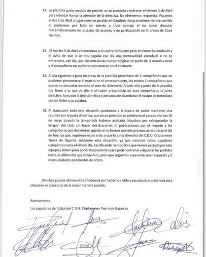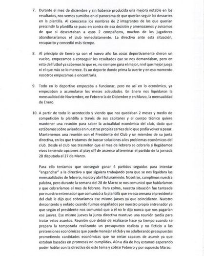 En esta publicación, manifiestan “Bueno pues ahora va saber la gente, nuestra versión, nuestra voz callada hasta ahora, para poder recuperar una cosa que es nuestra y que nosotros no hemos fallado a nadie y hemos cumplido, cosa que en este mundo del fútbol, hay gente que se dedica a engañar y tener poca palabra, si señores si, esto es el día a día del fútbol modesto, gente que cumple poco su palabra y su compromiso, ahora podemos estar tranquilos y con la conciencia bien tranquila de que hemos dado todo por este club y que no hemos sido correspondidos igual.