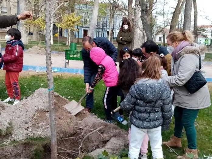 Los más pequeños han sido los encargados de la plantación de árboles autóctunos como álamos, moreras, melías y plantas aromáticas para llenar de color la zona de los paseos centrales y la fuente ahora que llega la primavera.