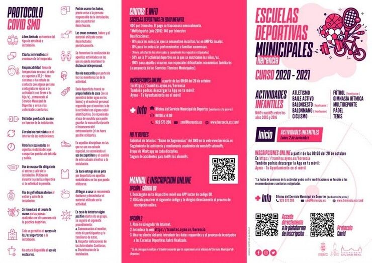 Respecto al modo de inscribirse a las diferentes modalidades deportivas, desde el Servicio Municipal de Deportes continuará fomentándose, como viene haciéndose en los últimos años, la tramitación telemática; por eso a partir de la fecha de comienzo de inscripciones podrán realizarse esta gestiones a través de la plataforma habilitada en la web municipal https://tramites.aymo.es/herencia; a la cual podrá accederse directamente a través del código QR habilitado en los carteles promocionales.