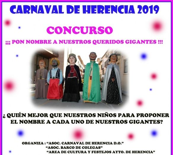 Los Gigantes que tradicionalmente, junto a los Cabezudos y Perlé, encabezan los pasacalles o trágalas diarias del Carnaval de Herencia, son un símbolo importante dentro de la fiesta, aunque nunca se ha sabido ni su nombre, ni su historia. Por eso, este año desde las asociaciones Carnaval de Herencia D.O., Barco de Colegas, área de Cultura y Festejos del Ayuntamiento de Herencia y en colaboración con los centros de educación de primaria Ntra. Sra. de la Merced y C.E.I.P: Carrasco Alcalde y sus respectivas AMPAS, se ha organizado este concurso, para que sean los mas pequeños los que den nombre propio a cada uno de los cinco gigantes que pasean por las calles en estos días de fiesta.
