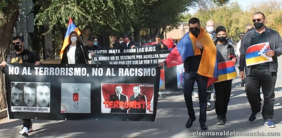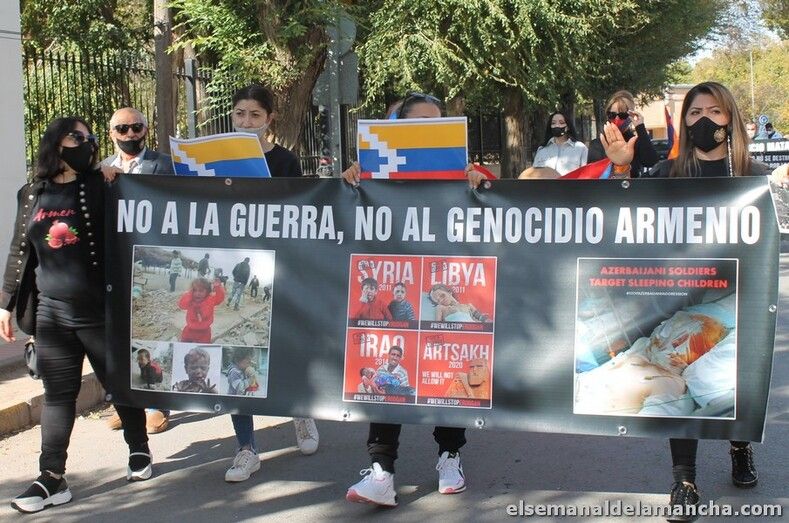 “No a la guerra, no al genocidio armenio”, “No al terrorismo, no al racismo”, “El silencio mata, abrid los ojos” o “El mundo no se destruye por aquellos individuos que hacen el mal, sino por los que lo ven y se quedan callados” son algunos de los lemas y denuncias que hoy se han podido ver en Herencia para denunciar la guerra en Armenia y el silencio internacional sobre la misma.