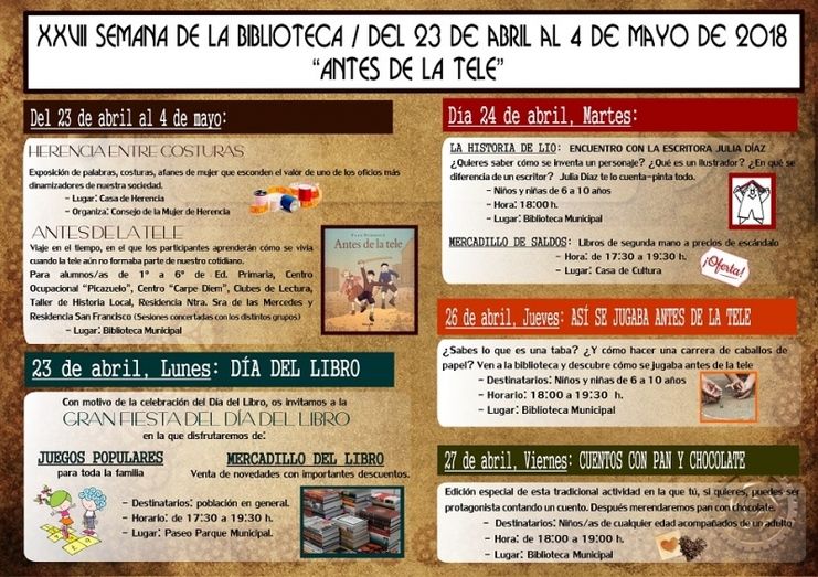 La concejala de Educación Lola Fernández ha declarado que “se trata de un programa especial con actividades dirigidas a todos los públicos y que pretenden favorecer un encuentro entre la cultura y la ciudadanía a través de la lectura, los libros, la animación y el juego”. Además cabe destacar, que el Ayuntamiento de Herencia apuesta, de manera real, en la Biblioteca Municipal con la incorporación y el aumento progreviso, año tras año, de fondos bibliográficos.