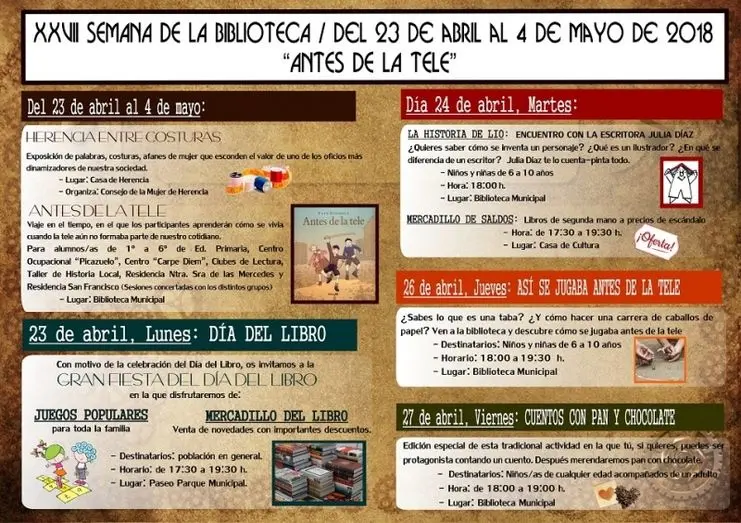 Coincidiendo con la conmemoración del Día Internacional del Libro, la Biblioteca Municipal “Miguel de Cervantes” comienza con la celebración de su semana festiva, que este año cumple su XXVII edición y que hará un viaje en el tiempo, en el que todos los participantes aprenderán como se vivía cuando la televisión aún no formaba parte de la convivencia cotidiana.