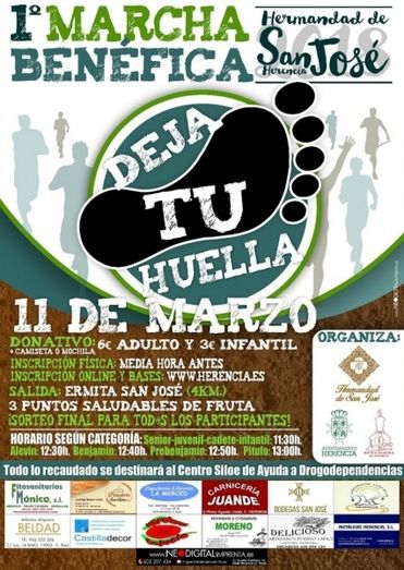 Por su parte, la Hermandad de San José ha preparado una actividad novedosa, dentro de su programa festivo en honor a su titular. Este domingo también se celebrará la I Marcha Benéfica “Deja tu huella”, un evento sano y solidario a partes iguales. A lo largo de los 4 kilómetros del recorrido establecido habrá 3 puntos saludables de fruta para que todos los participantes, grandes y pequeños, puedan coger fuerzas a lo largo del trayecto. Y por otro lado, el dinero recaudado de las inscripciones irá destinado al Centro Siloe de Ayuda a la Drogodependencia. Además, la organización realizará diferentes sorteos para todos los participantes.