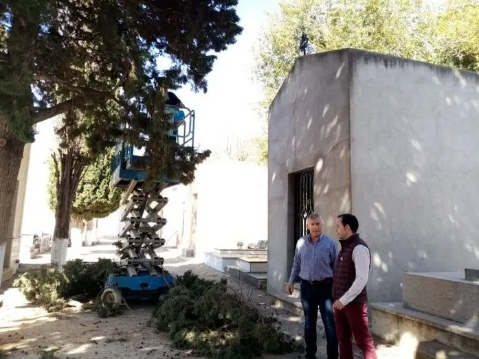 La ejecución de estos trabajos, que se están llevando a cabo por los operarios municipales con una máquina elevadora que facilita la poda en altura, resulta una tarea fundamental para prevenir el riesgo de caída de ramas y para controlar el tamaño de árboles que en muchas ocasiones su ubicación junto a los nichos o tumbas, no permite su desarrollo completo.