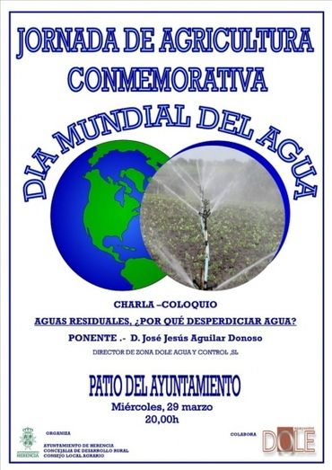 El próximo 29 de marzo a partir de las 20:00 horas, el patio de Ayuntamiento de Herencia acogerá una jornada de carácter técnico dirigida al sector agrario y ganadero, para conmemorar el Día Mundial del Agua. La ponencia correrá a cargo de D. José Jesús Aguilar Donoso director de zona de DOLE, Agua y Control.