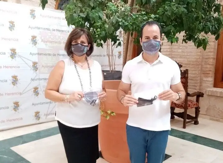 El alcalde de Herencia, Sergio García-Navas, y la concejala de Festejos Inmaculada Díaz-Flores, han presentado la mascarilla que se repartirán durante los días de las atípicas fiestas que, como muchos municipios, Herencia no podrá celebrar ante la difícil situación originada por la COVID-19.