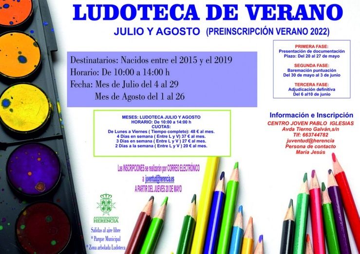 De cara a los meses estivales de julio y agosto, y para ofrecer a los más pequeños una alternativa de ocio y aprendizaje, el Ayuntamiento de Herencia amplía el servicio de ludoteca también en verano.