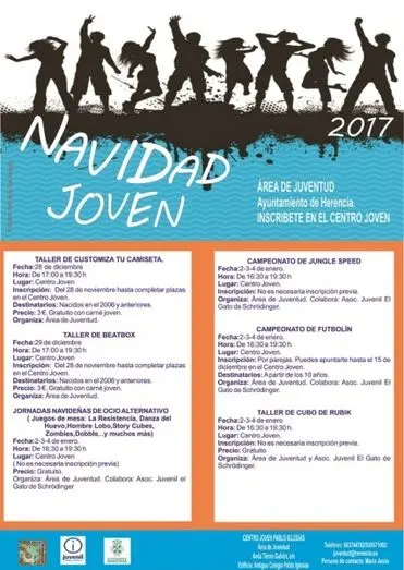 El área de Juventud del Ayuntamiento de Herencia presenta la programación navideña destinada a que los más jóvenes del municipio, puedan disfrutar del tiempo de ocio en las próximas vacaciones.