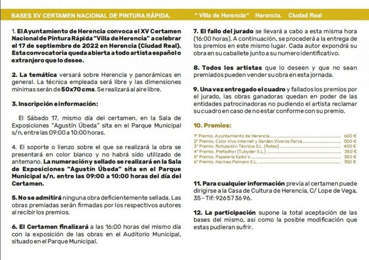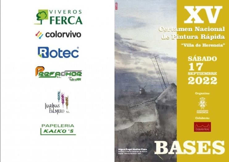 El Ayuntamiento de Herencia, en colaboración con la Diputación Provincial de Ciudad Real, convoca el XV Certamen Nacional de Pintura Rápida “Villa de Herencia”, que este año como novedad, se celebrará durante el fin de semana previo a la Feria, concretamente el sábado 17 de septiembre .
