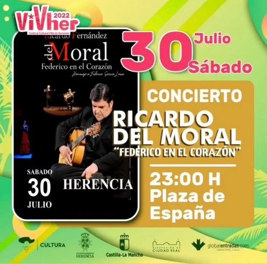 Las actividades del Festival Cultural “ViVher” 2022, celebradas en Herencia, continuarán a lo largo del mes de julio y de agosto. El guitarrista y cantaor Ricardo del Moral dará el sábado 30 de julio a las 22:00 un concierto enmarcado dentro de esta celebración, en el que homenajeará a Federico García Lorca.