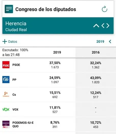 El Partido Socialista también ha ganado las elecciones en Herencia, localidad donde ha obtenido un total de 1.673 votos, lo que supone el 37,50% del resultado electoral. El PSOE ha ganado votos con respecto a los pasados comicios, cuando obtuvo 1.362 votos.
