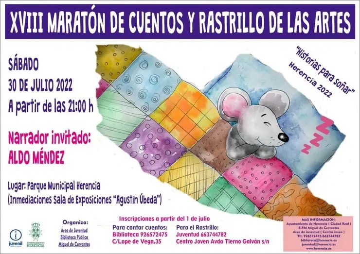 La Biblioteca Municipal y el área de Juventud organizan el Maratón anual de Cuentos y Rastrillo de las Artes, una actividad que este año cumple su mayoría de edad, y que tendrá lugar el próximo sábado 30 de julio a partir de las 21 horas, en las inmediaciones de la Sala de Exposiciones “Agustín Úbeda” y alrededor de la fuente del Parque Municipal.