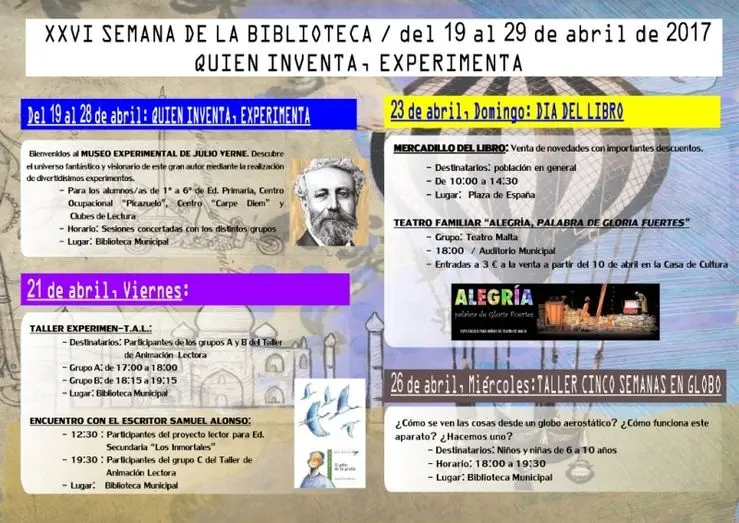 Entre las múltiples actividades previstas para estos día se encuentran la visita de los alumnos de Primaria de todos los centros educativos al Museo Experimental de Julio Verne para descubrir el universo fantástico del autor a través de divertidísimos experimentos o el encuentro con el escritor Samuel Alonso. También participarán en esta semana los usuarios del Centro Ocupacional “Picazuelo”, los residentes del centro “Carpe Diem” y de la residencia “Ntra. Sra. de las Mercedes” y los distintos Clubes de Lectura de la Biblioteca Municipal.